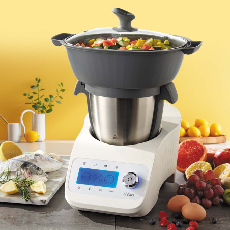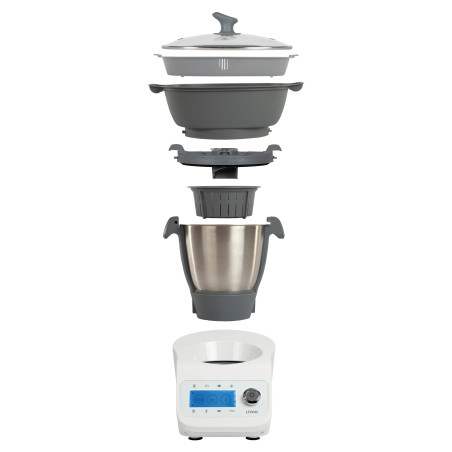 L’utilisation est simple et intuitive, grâce à un écran tactile clair et un bouton de navigation unique. Vous définissez les paramètres de votre préparation (température, temps de cuisson, vitesse) et Super Cooker se charge du reste. 2 programmes sont également prédéfinis (vapeur, gâteaux). Son travail achevé, il s’arrête et l’indique d’un signal sonore.