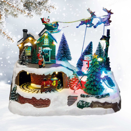 Neige, bonhomme souriant, petit train qui tourne au rythme de 8 mélodies traditionnelles, lumières scintillantes et, bien sûr, le Père Noël s’envolant dans son traîneau tiré par ses fidèles rennes... plongez dans la féérie de Noël avec cette scène au charme d’autrefois. À poser près du sapin ou d’une fenêtre, chaque détail émerveille petits et grands.