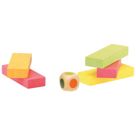 Contenu : 54 planchettes en hêtre teintées à l’eau sans COV (7 x 2,3 x 1,1 cm), 1 dé.