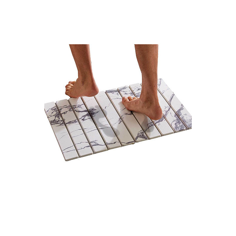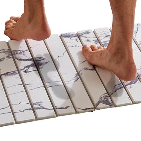 En pierre de diatomite, roche poreuse absorbante et antibactérienne, ce caillebotis effet marbre boit l’eau, tel un buvard, et ne laisse pas de trace : à peine vos pieds posés dessus qu’ils sont déjà secs ! Et dès que vous le quittez, il sèche instantanément... votre sol ne se transformera plus en patinoire !