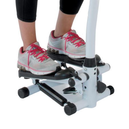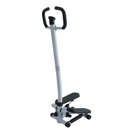 Doté d’un guidon pour une utilisation sûre et confortable, ce stepper tonifie les fessiers, les jambes et même les abdominaux grâce à sa double action. Au mouvement de simulation de montées de marches, il associe un mouvement de déhanché (twist) pour travailler la mobilité des hanches, du bassin ainsi que le renforcement des adducteurs. Son compteur digital permet de suivre vos performances (durée, nombre de pas, calories consommées).